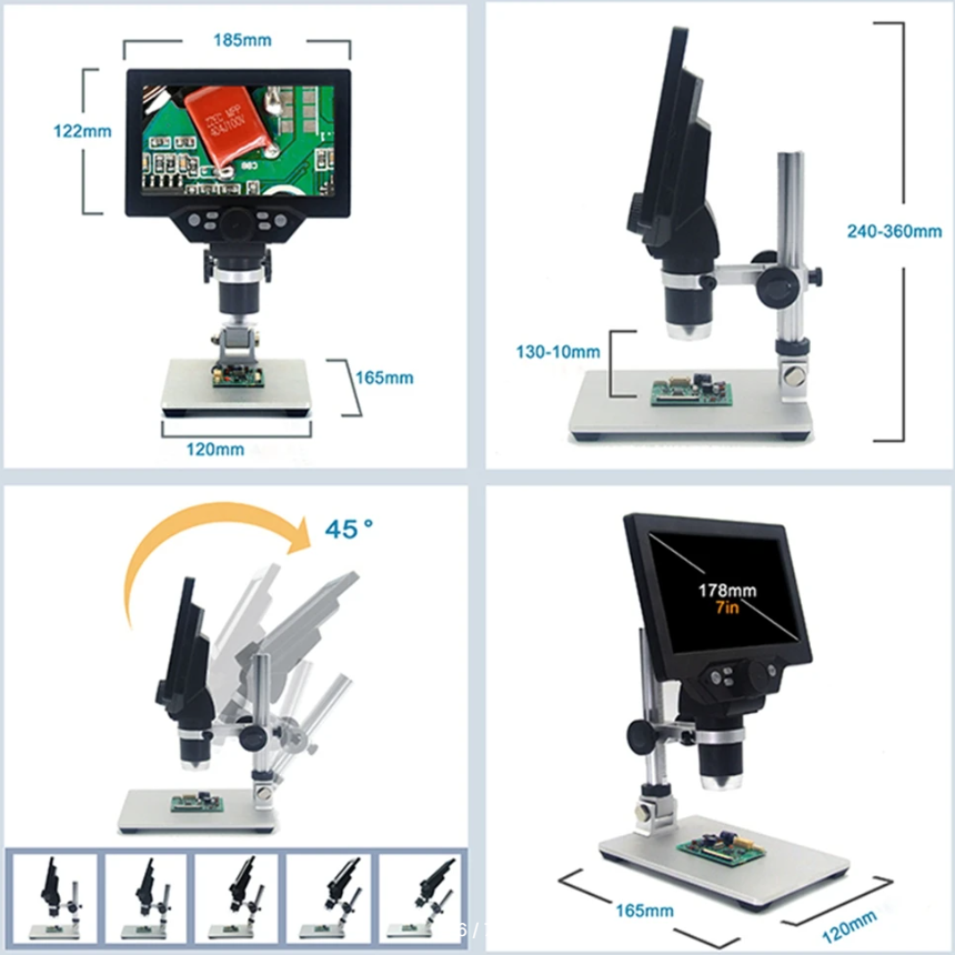 С помощью настраиваемой фокусировки, дисплея и регулируемого кронштейна можно с удобством изучать SMD светодиоды, печатные платы, микрочипы, различать на них мелкие детали, где припаяны контакты, а где нет. Во время работы есть возможность записи фото и видео, для последующего изучения материалов на компьютере или другом мониторе. Кадры сохраняются на SD-карту, с максимальным разрешением 1280x720.
